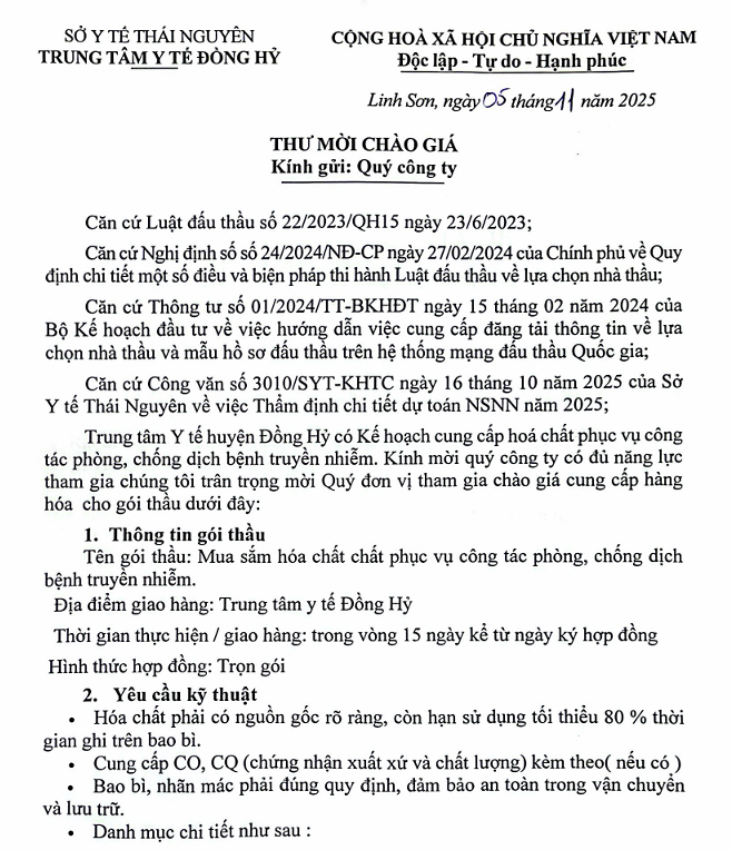 Thông báo mời chào giá Sửa chữa, bảo dưỡng, nuôi cấy vi sinh cho hệ thống xử lý nước thải Trung tâm Y tế Đồng Hỷ